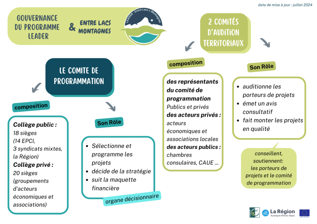 Pendant le fonctionnement du programme, toutes les décisions sont prises par un commité de programmation. Celui-ci est composé d’acteurs locaux publics et privés. Pour le programme LEADER Entre Lacs et Montagnes, les élus sont des représentants des 14 EPCI du territoire et des 3 Syndicats Mixtes. Les acteurs privés sont assez variés, pour permettre à la fois une bonne représentativité de la vie locale, mais également des regards d’experts dans des domaines complémentaires.