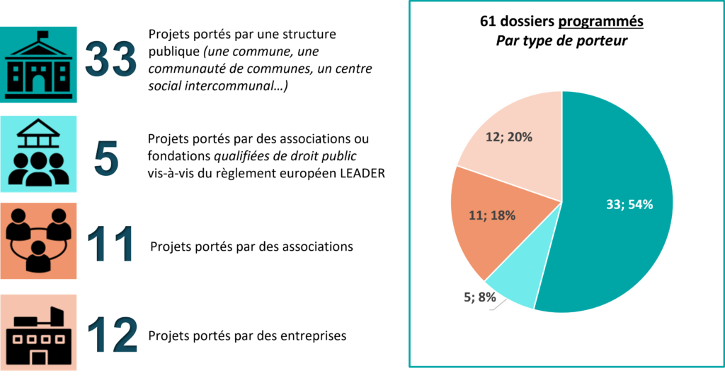 Le programme LEADER s’adresse aussi bien aux porteurs publics (communes, syndicats mixtes, intercommunalités…) qu’aux associations ou aux petites entreprises. Voici la répartition des 61 projets programmés depuis le démarrage du programme :