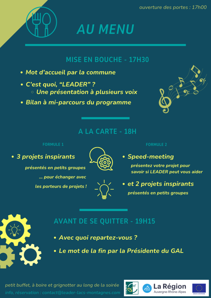 - Speed-meeting LEADER => Vous avez un projet et vous aimeriez savoir si LEADER peut vous aider? Quelques créneaux seront disponibles pour rencontrer une personne de l’équipe technique, inscrivez-vous vite !